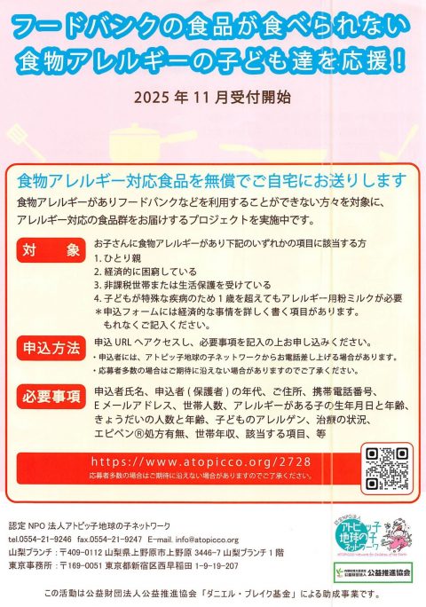 この度、食物アレルギーを持つお子さんを持つご家庭に向けて、大変重要な支援情報が入ってきましたので、皆様にお知らせいたします。